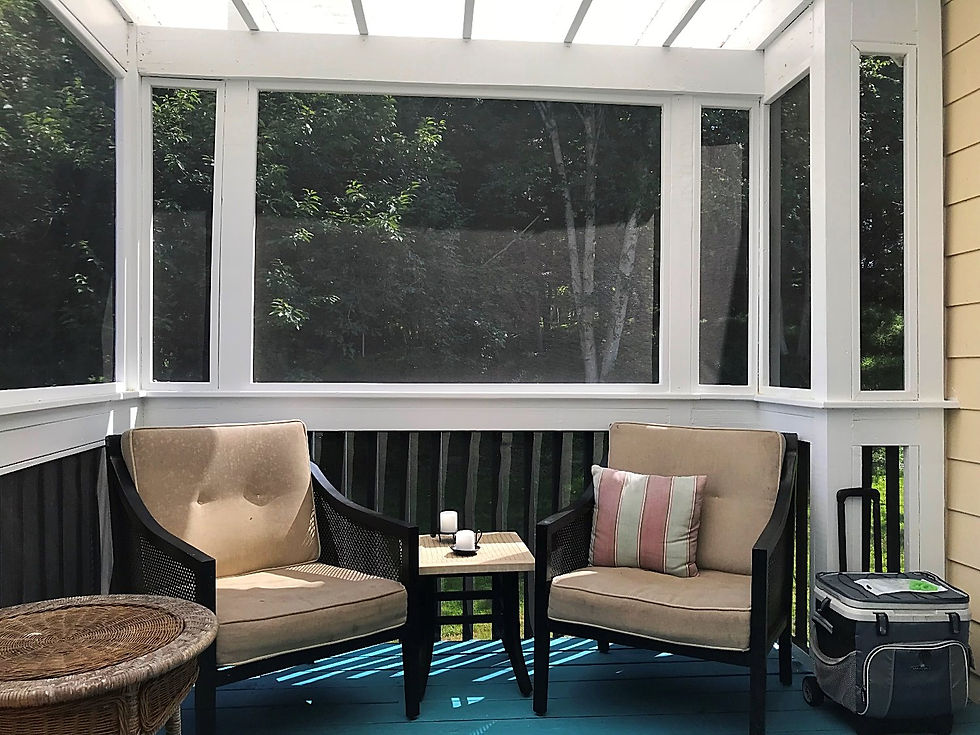 Solution: For this sunroom addition, L+K evaluated the existing residential zoning setback and foundation configuration and determined that an expanded sunroom could be constructed in place of the screen room footprint. The owners were interested in creating a new comfortable, flexible space for year round living. The new enlarged four season sunroom with vaulted ceiling and steel rod-tied exposed beams, re-purposed flooring, and gas fireplace has become the room of choice for relaxed living any season of the year.